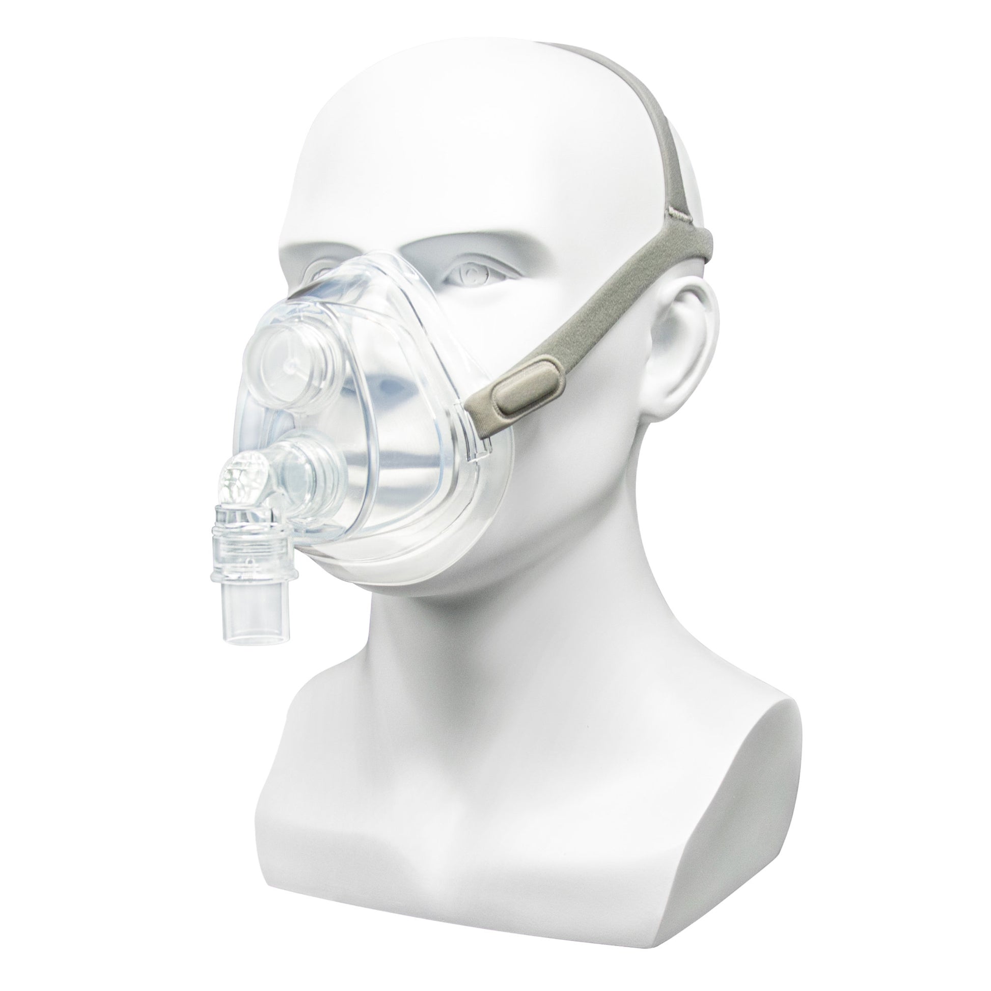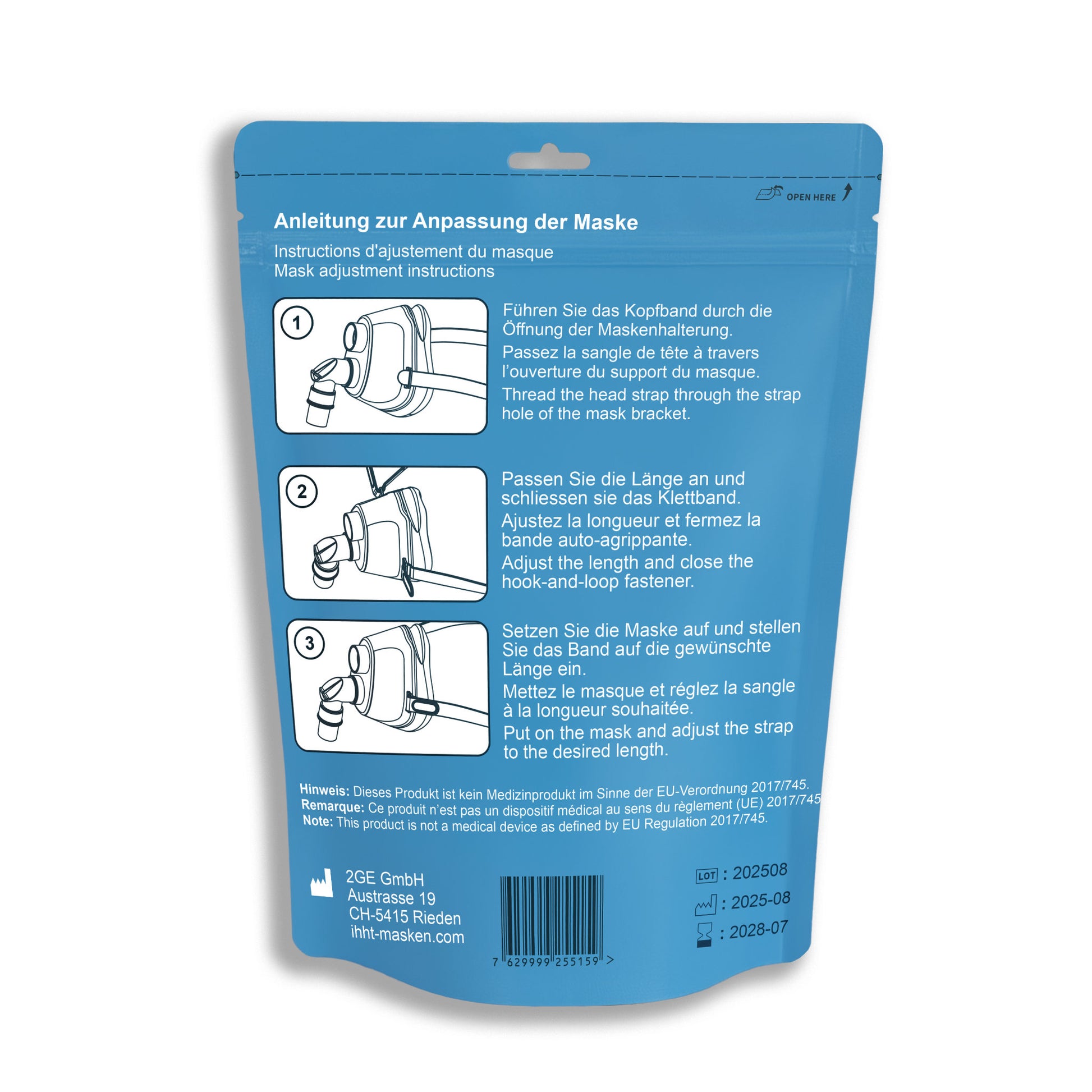 Das elastische, längenverstellbare Kopfband mit Klettverschluss lässt sich individuell anpassen und ermöglicht ein schnelles, einfaches Auf- und Absetzen der Maske – ganz ohne Hilfe. Ein integrierter, drehbarer Winkeladapter reduziert den Zug auf der Maske und erhöht den Tragekomfort zusätzlich.